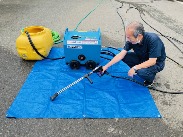 高圧洗浄機で汚れを落とすので、機械の調子が良いかを確認します。」